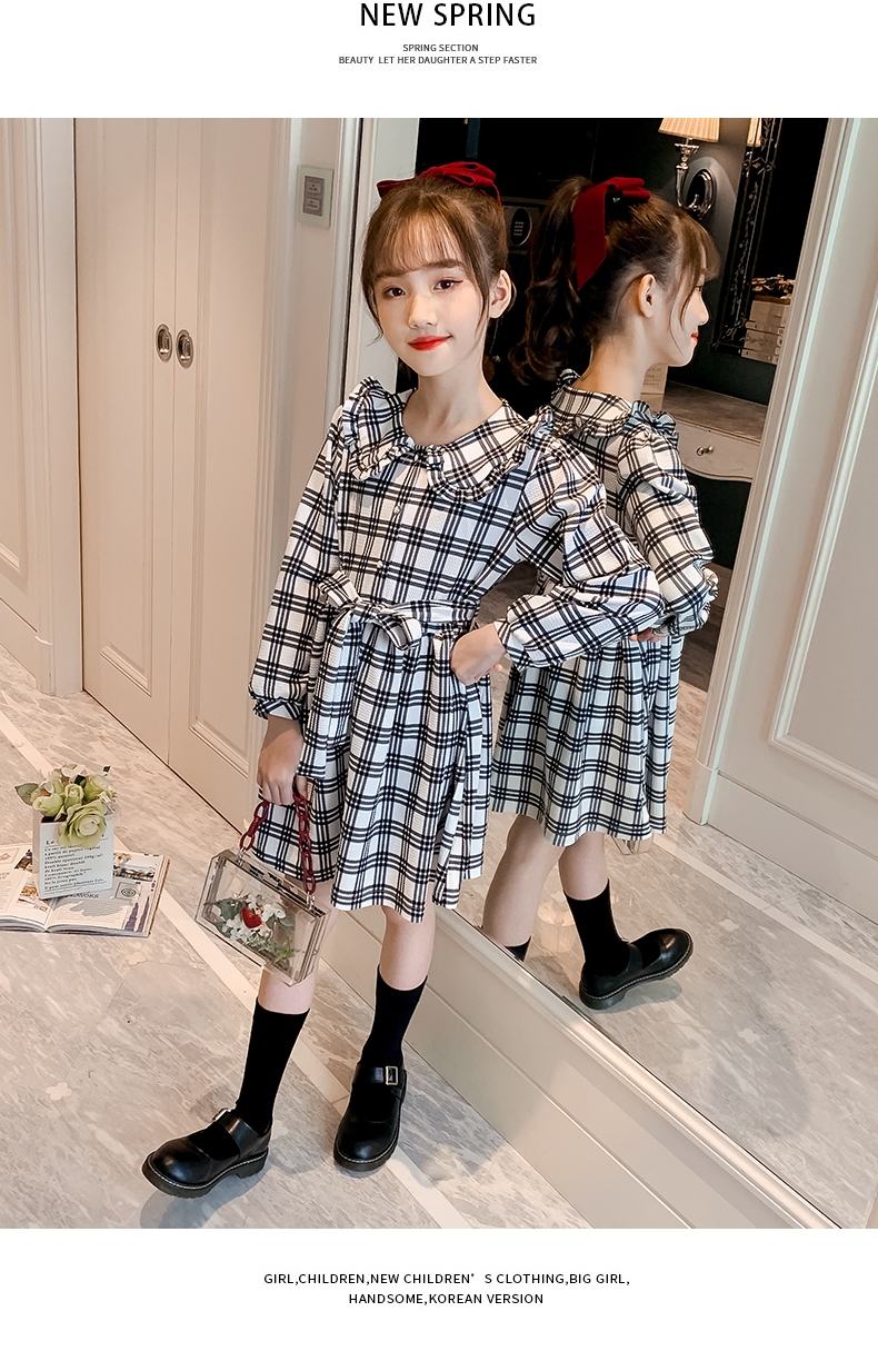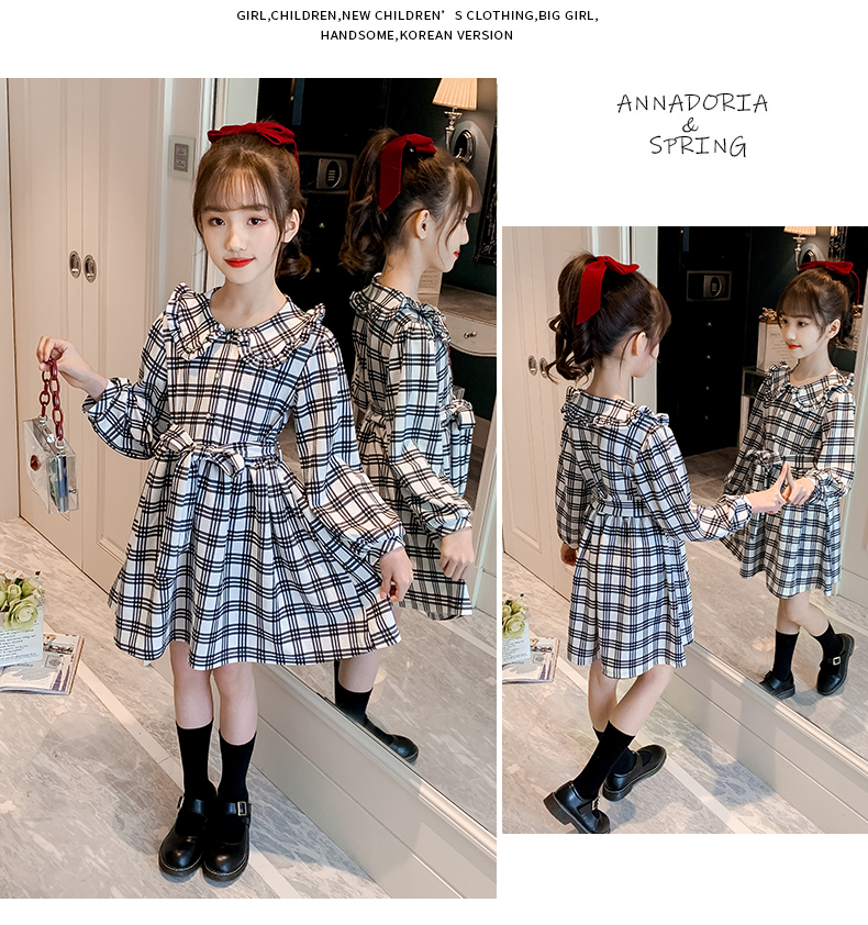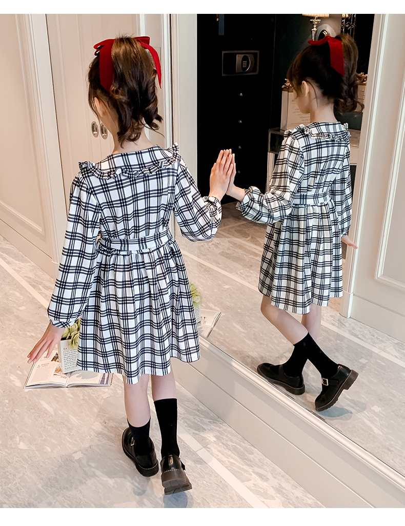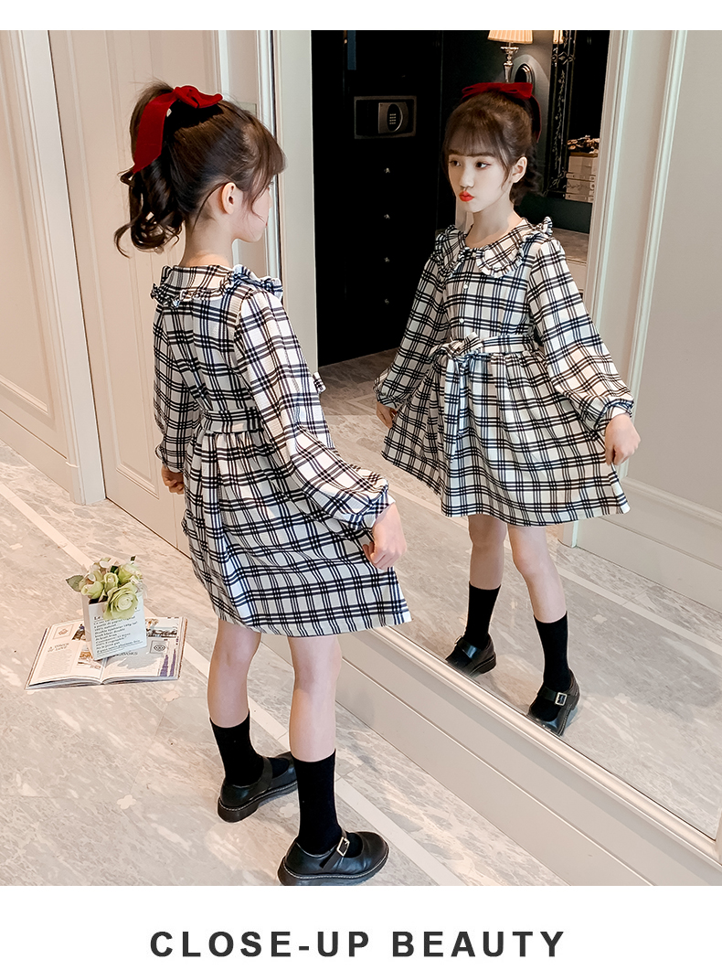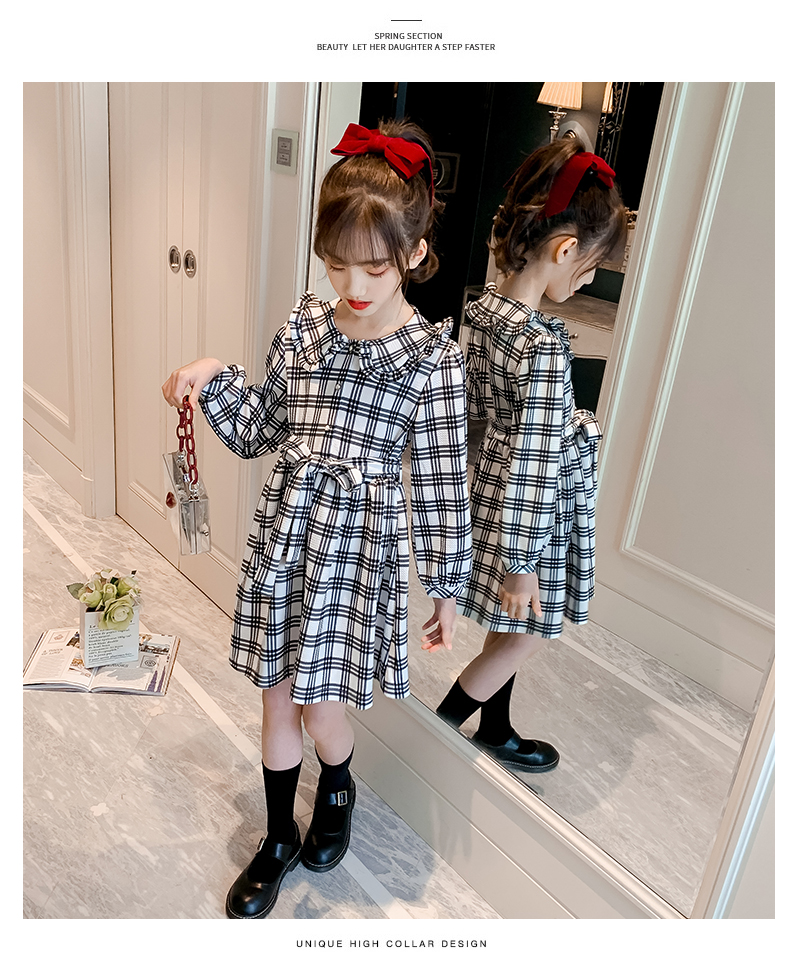 浪莎韓版女童花邊翻領(lǐng)黑白格子連衣裙2021春裝新款兒童長(zhǎng)袖公主裙