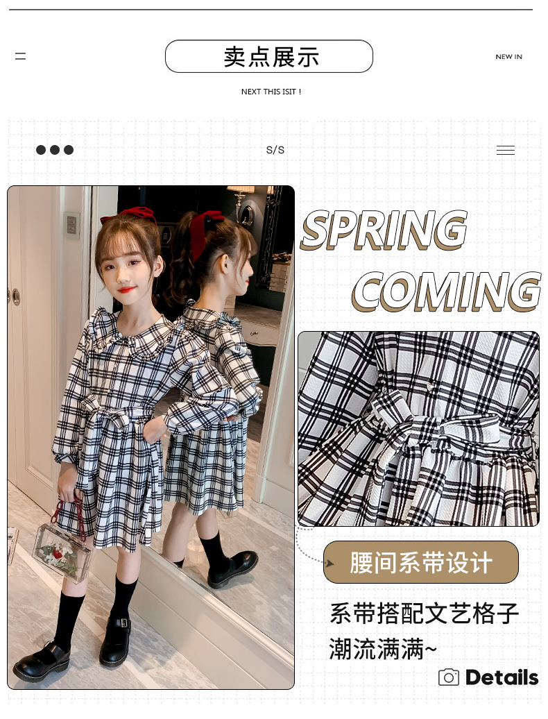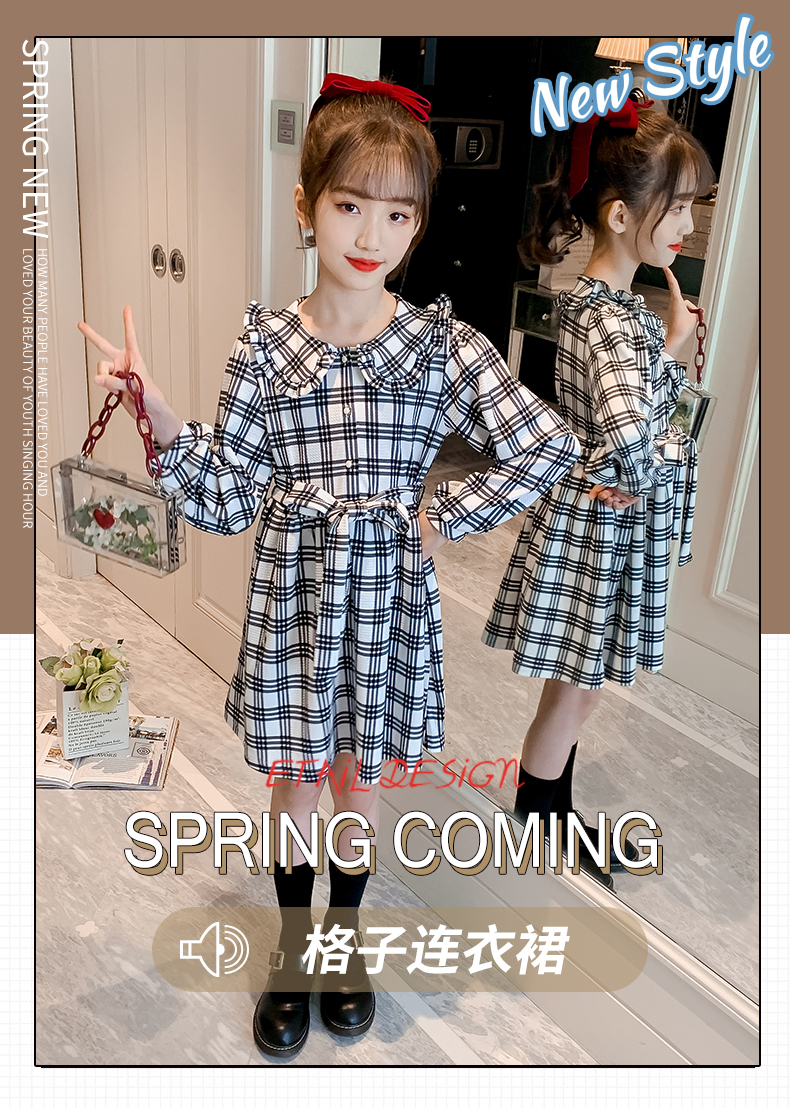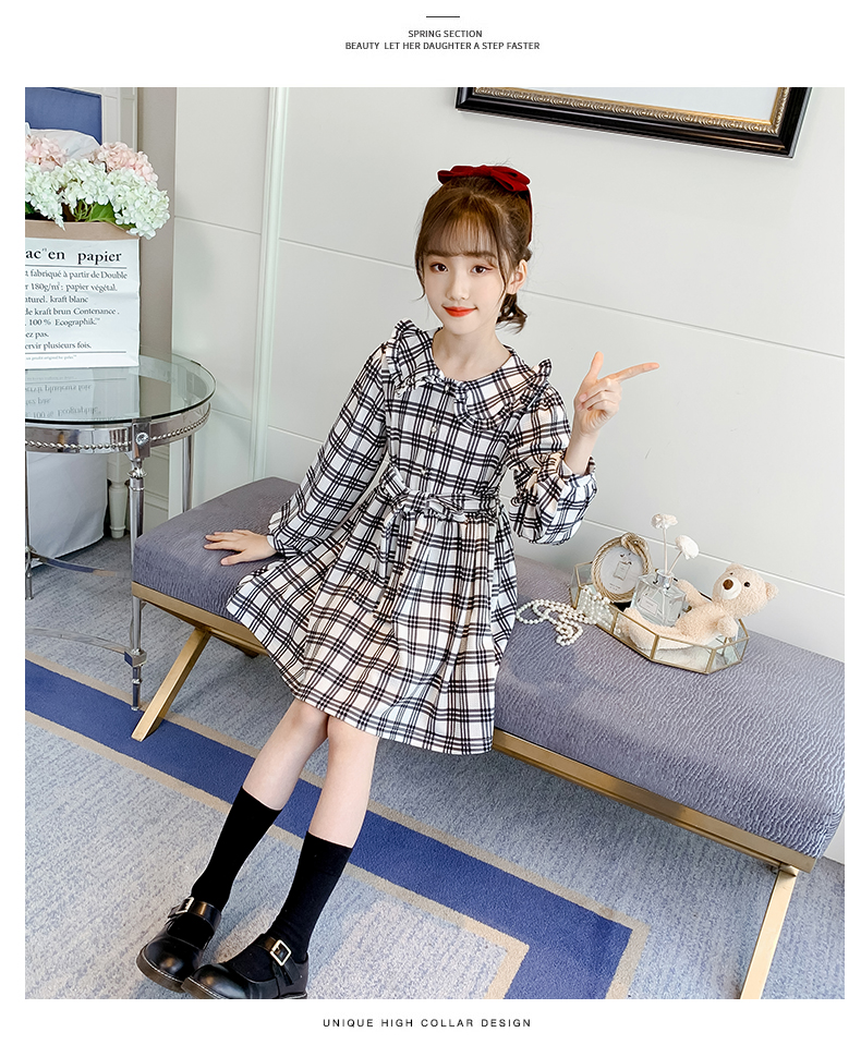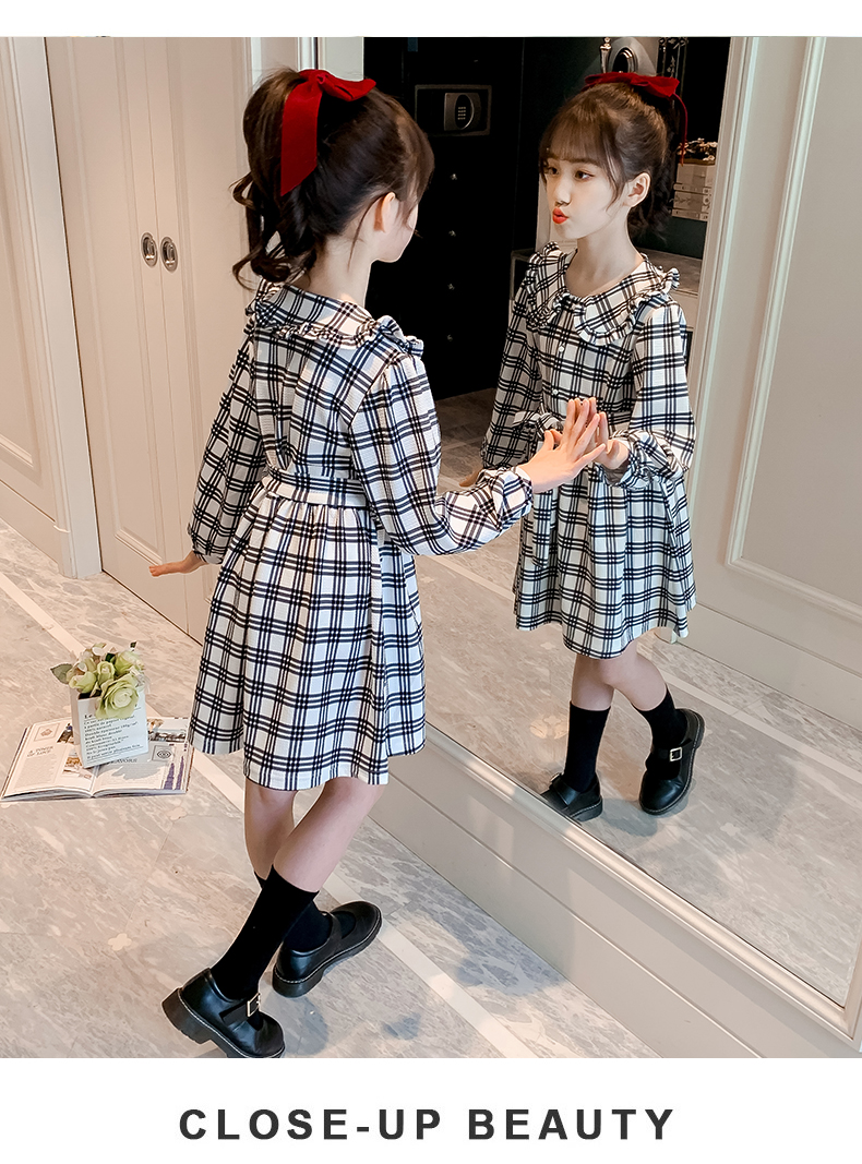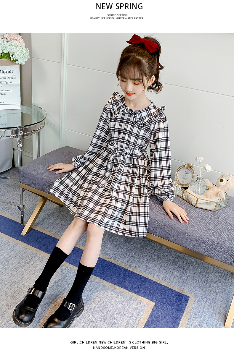 浪莎韓版女童花邊翻領(lǐng)黑白格子連衣裙2021春裝新款兒童長(zhǎng)袖公主裙