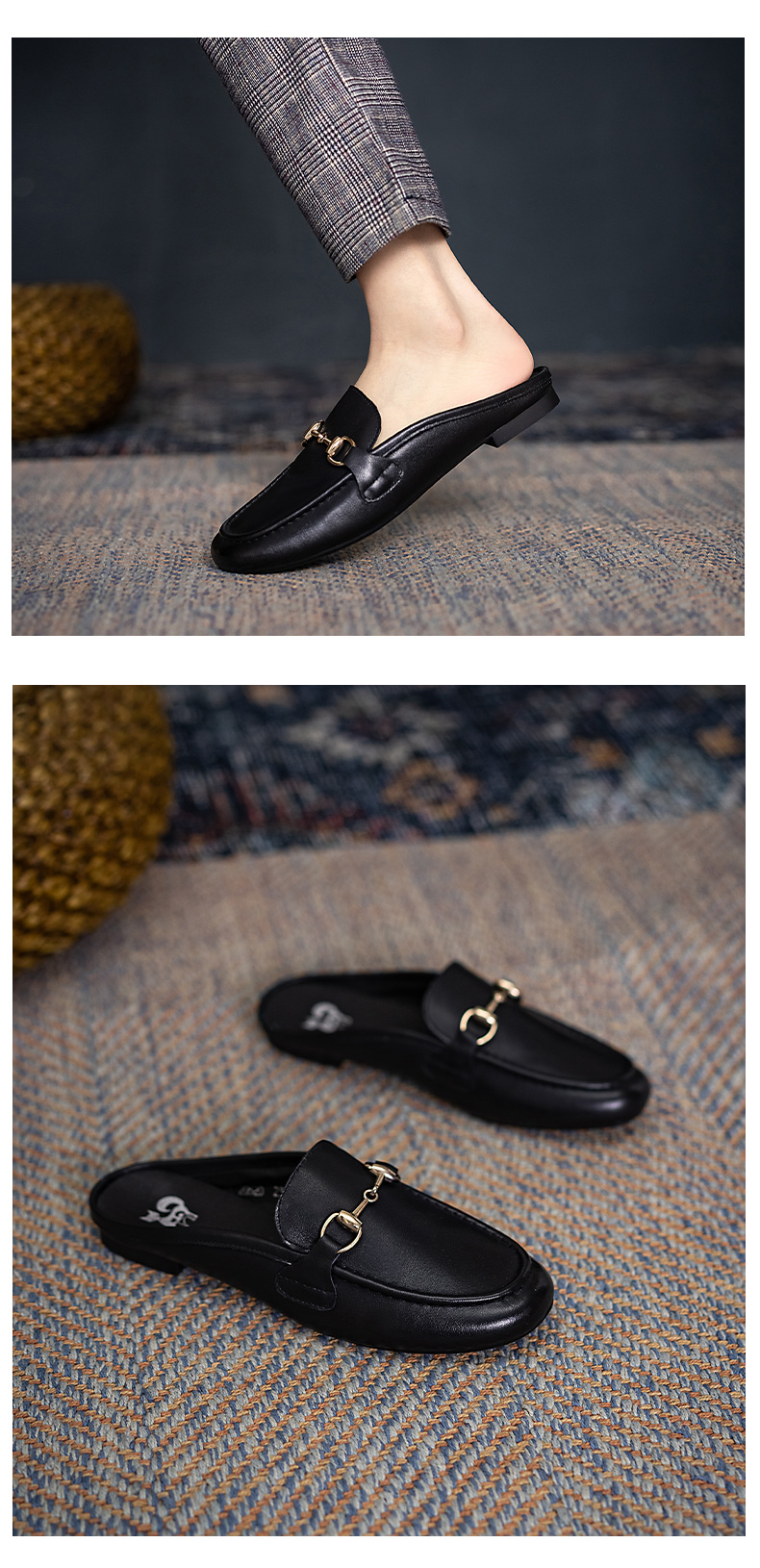 浪莎包頭拖鞋女夏外穿2021春真皮平底半拖鞋粗跟圓頭搭扣穆勒涼拖